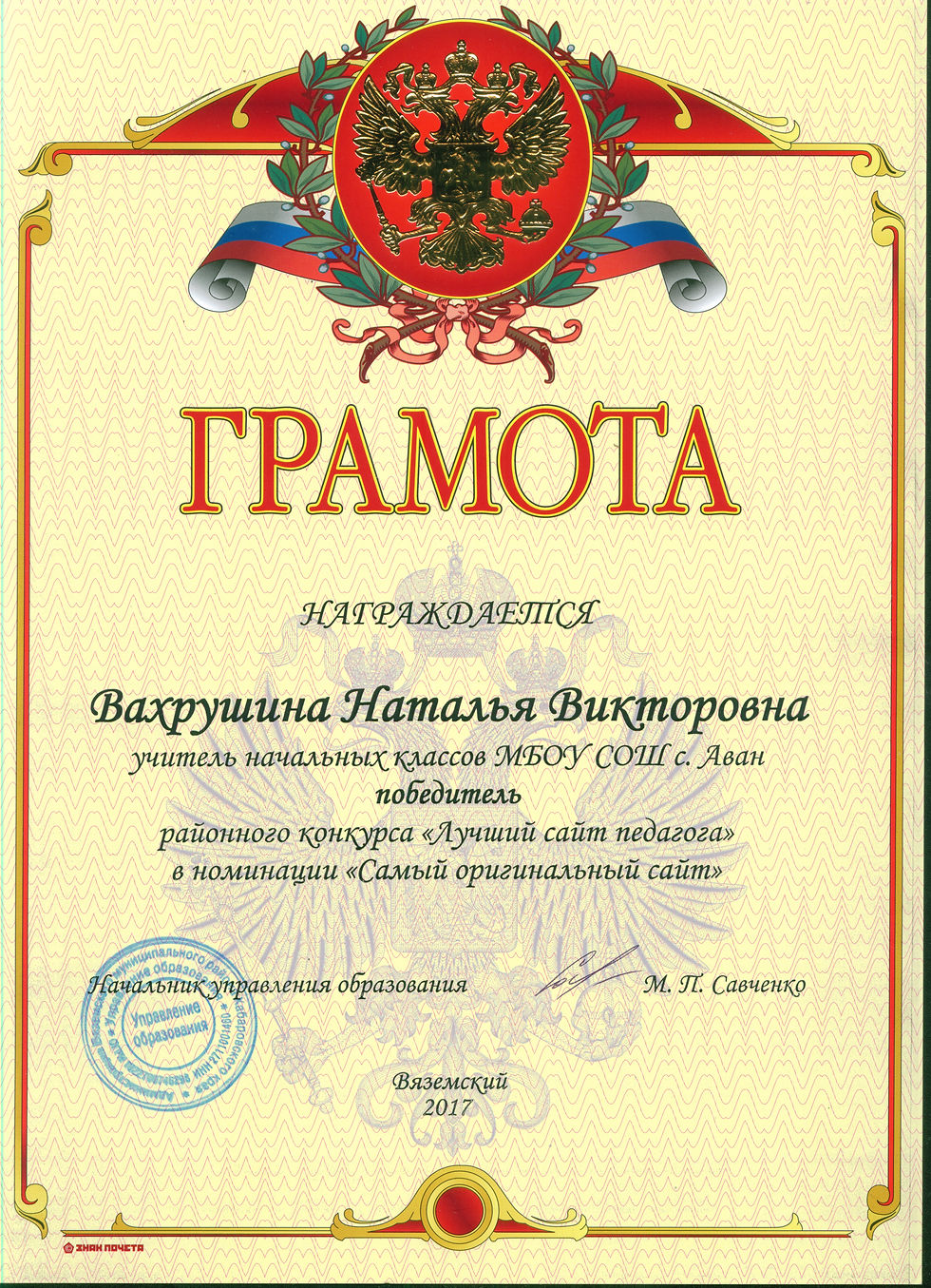 Заняла первое место районном конкурсе для педагогов «Лучший сайт учителя»